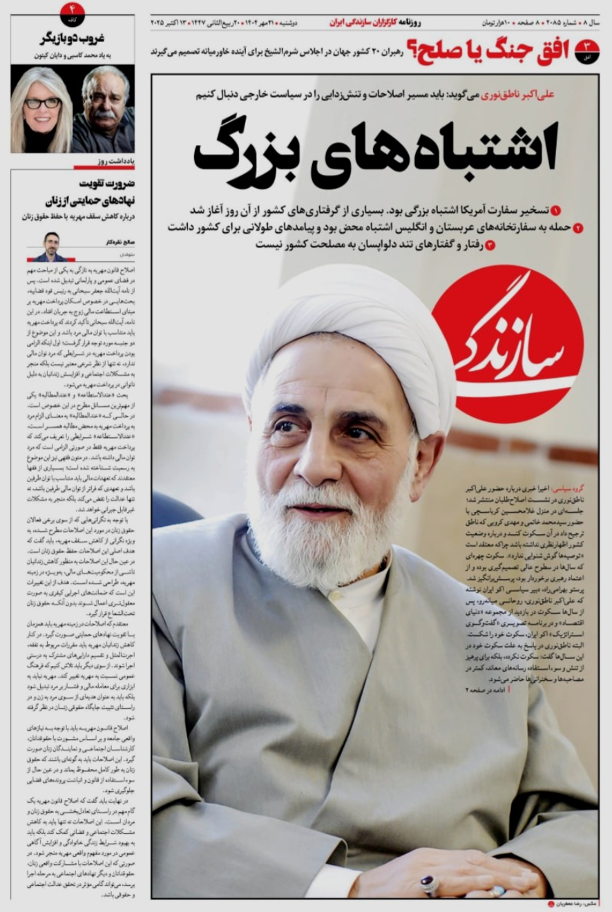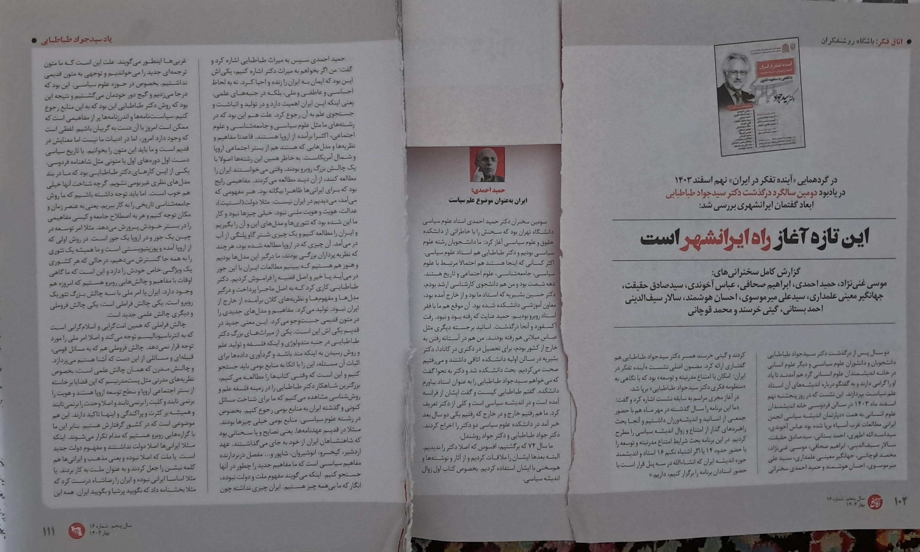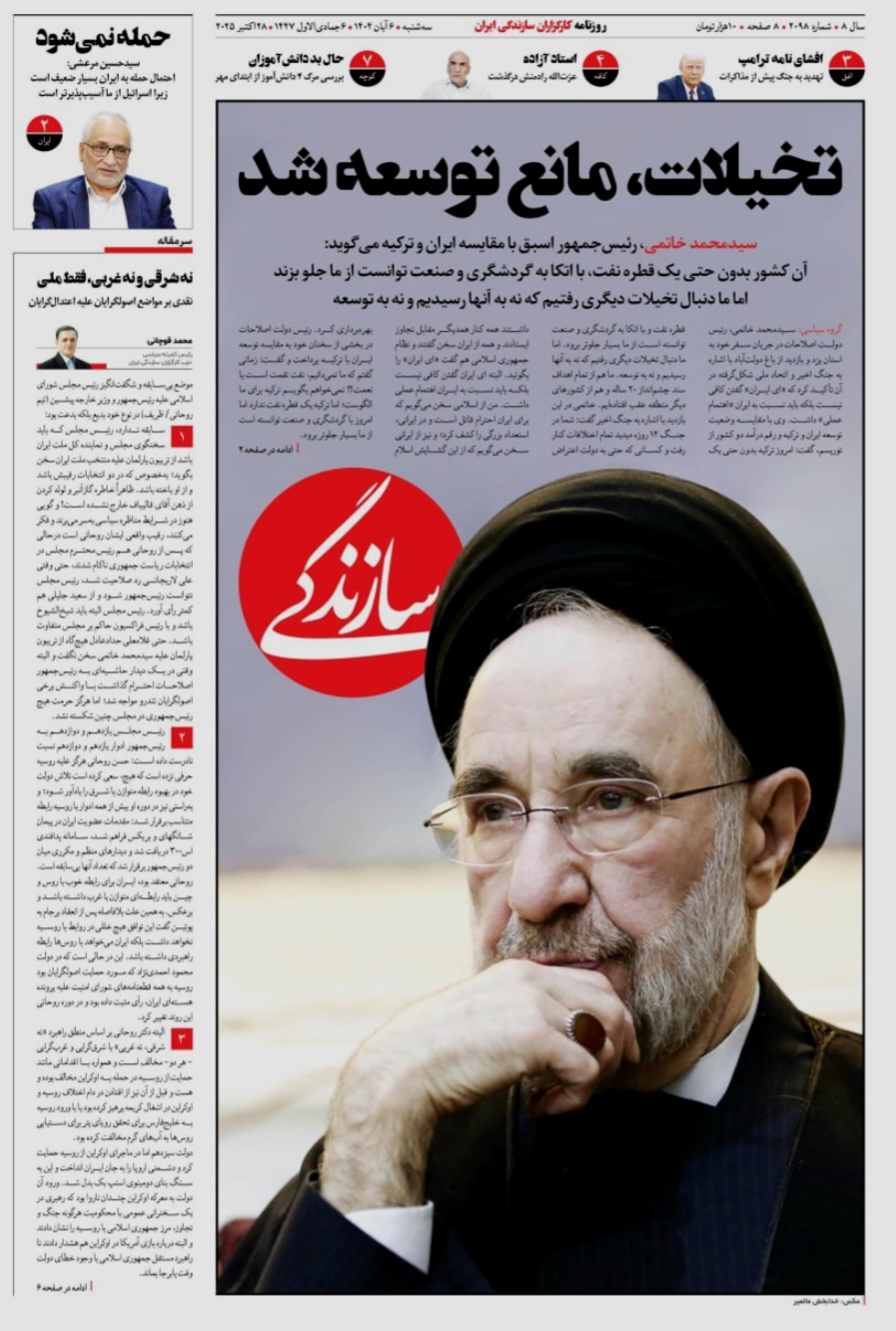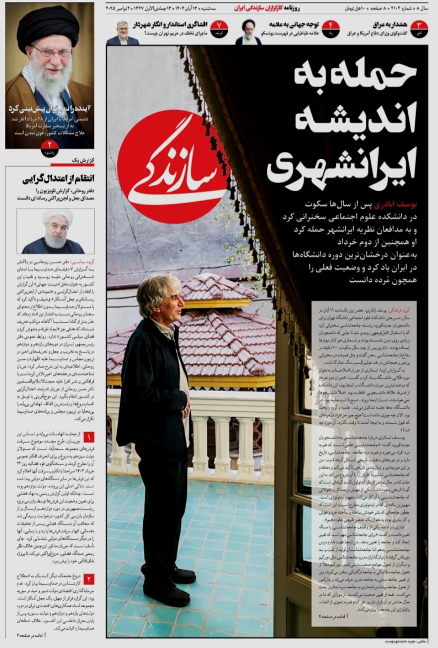 در روز 13 آبان 1404 روزنامه ی سازندگی، صفحه ی اول خود را به خبری از سخنرانی جدید دکتر یوسف اباذری اختصاص داد با تیتر درشت «حمله به اندیشه ی ایرانشهری: یوسف اباذری پس از سالها سکوت در دانشکده ی علوم اجتماعی سخنرانی کرد و به مدافعان نظریه ی ایرانشهر حمله کرد. او همچنین از دوم خرداد بهعنوان درخشانترین دوره ی دانشگاهها در ایران یاد کرد و وضعیت فعلی را همچون مُرده دانست.» و به این شرح: